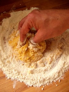 9. Take the dough out of the fridge and cut it in half. Cover the half you are not using with a clean kitchen cloth
