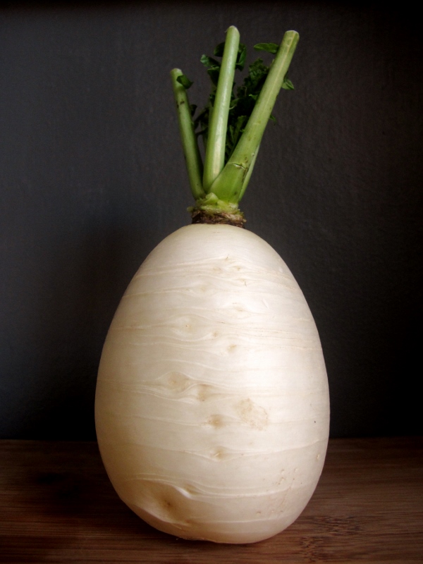 - In the meantime, peel the vegetables. Julienne the carrots into thin strips. Cut the daikon in half down the centre. Thinly slice the daikon into thin “crescents” or half-moons. Alternatively, julienne the daikon as you did the carrots