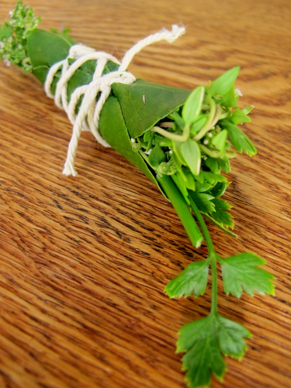 - In the meantime, make a bouquet garni using the bay leaves, parsley and thyme (you can either wrap the herbs in a piece of cheesecloth or simply tie them together using some string). Add the bouquet garni to the pot, along with tomato paste