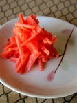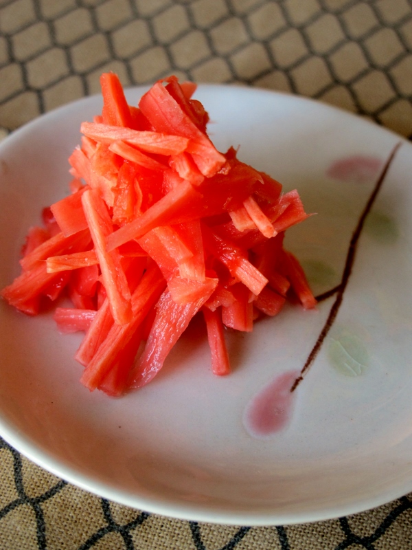 In terms of tsukemono as a condiment or garnish, beni shoga is perhaps the most commonly eaten pickle in Japan. Made by pickling ginger in red umeboshi brine, it is almost always used as a garnish on okonomiyaki, gyūdon and yakisoba. Outside of Japan though, the most likely form of tsukemono you’ll encounter is gari, which is ubiquitous with sushi and sashimi, although you are unlikely to find the lumo-pink version in Japan, where gari is normally a less alarming beige.