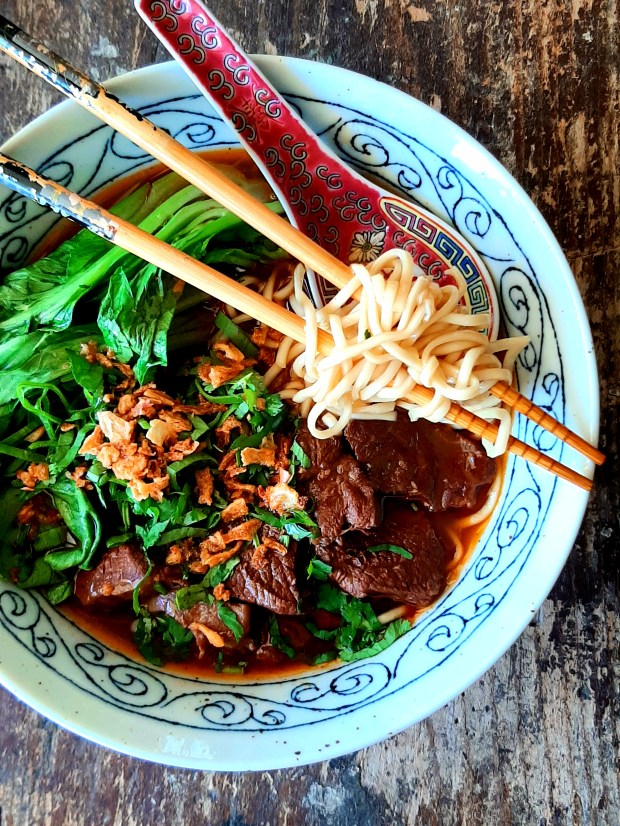 - Ladle the HOT broth over the noodles, then top with beef, bok choy, chopped spring onion and fresh coriander.