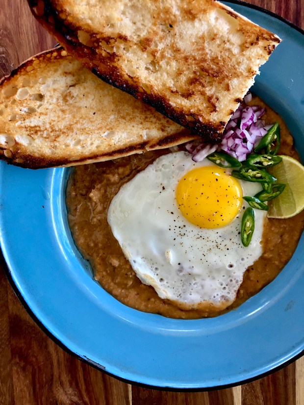 7. Serve in bowls topped with a fried egg and your choice of garnishes.