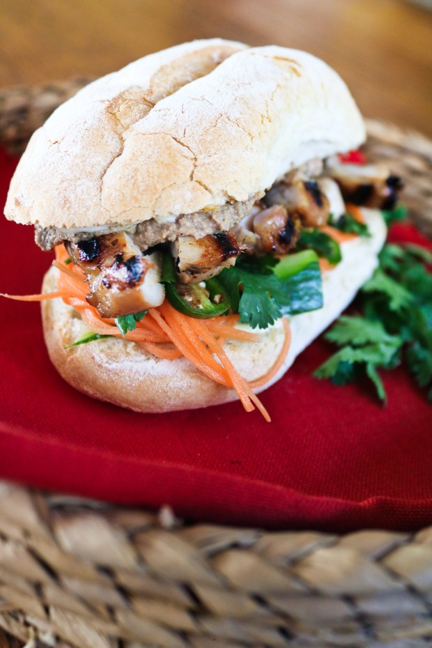 - Spread the mayonnaise on both sides of the baguette, the sprinkle over a few drops of Maggi Seasoning Sauce/light soy sauce over the mayo. Optional: spread a generous amount of chicken liver pâté on one side of the baguette (on top of the mayonnaise).